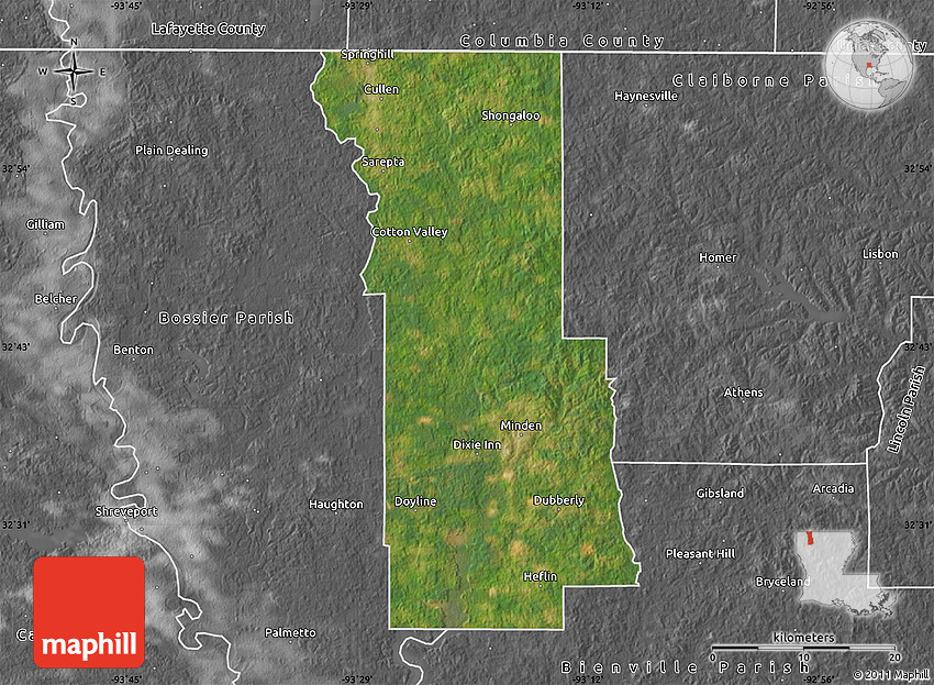The flat satellite map represents one of several map types and styles available. Look at Webster Parish, Louisiana, United States from different perspectives.