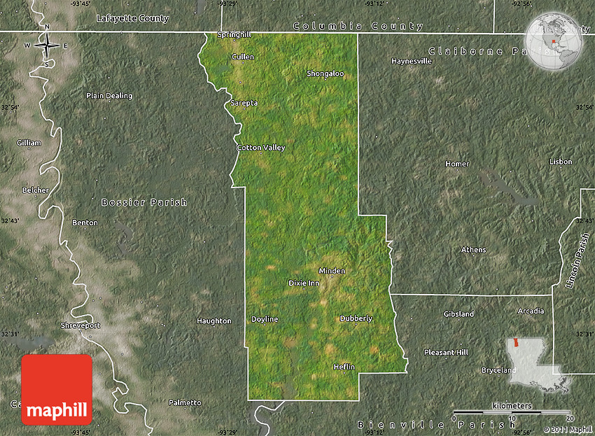 The flat satellite map represents one of several map types and styles available. Look at Webster Parish, Louisiana, United States from different perspectives.