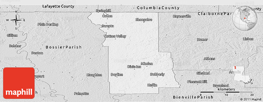 The panoramic silver style map represents one of several map types and styles available. Look at Webster Parish, Louisiana, United States from different perspectives.