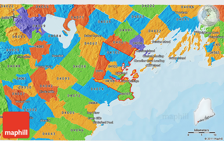 The 3D political map represents one of several map types and styles available. Look at ZIP codes starting with 041 from different perspectives.