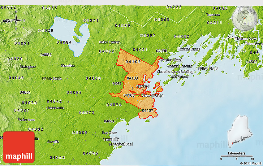 The 3D political shades map represents one of several map types and styles available. Look at ZIP codes starting with 041 from different perspectives.
