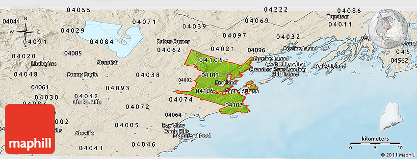The panoramic physical map represents one of several map types and styles available. Look at ZIP codes starting with 041 from different perspectives.