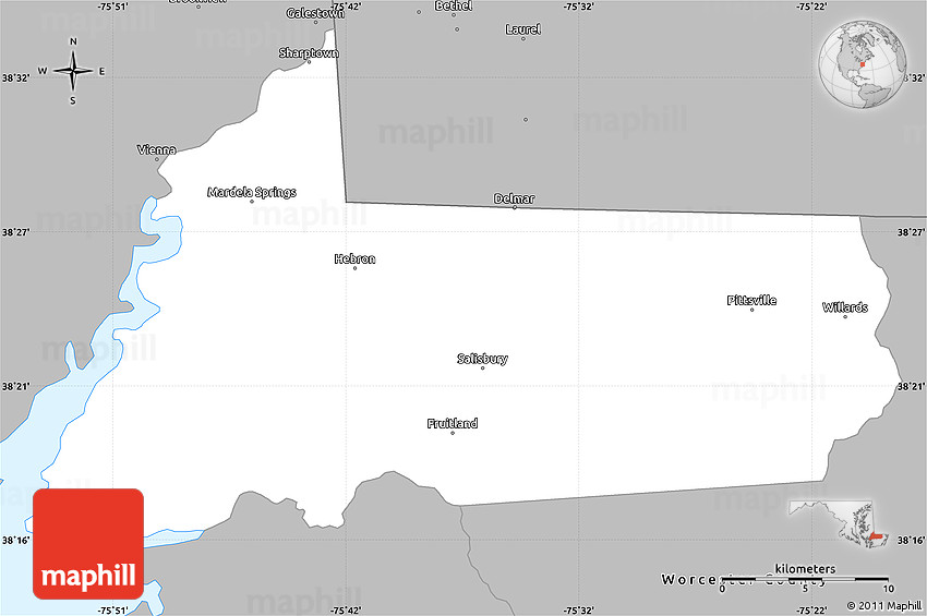The simple gray outline map represents one of several map types and styles available. Look at Wicomico County, Maryland, United States from different perspectives.