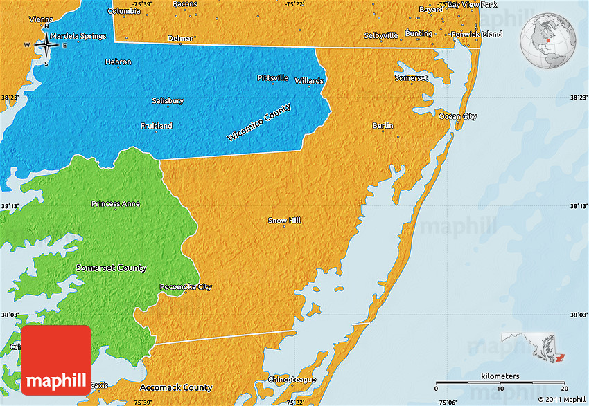 The flat political map represents one of several map types and styles available. Look at Worcester County, Maryland, United States from different perspectives.