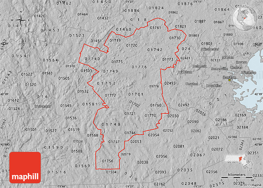 The flat gray map represents one of several map types and styles available. Look at ZIP codes starting with 017 from different perspectives.
