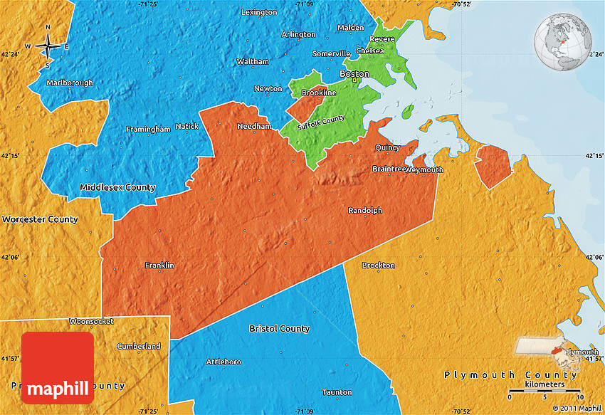 The flat political map represents one of several map types and styles available. Look at Norfolk County, Massachusetts, United States from different perspectives.