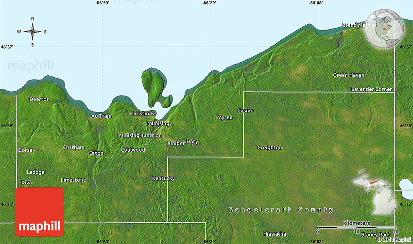 The flat satellite map represents one of several map types and styles available. Look at Alger County, Michigan, United States from different perspectives.