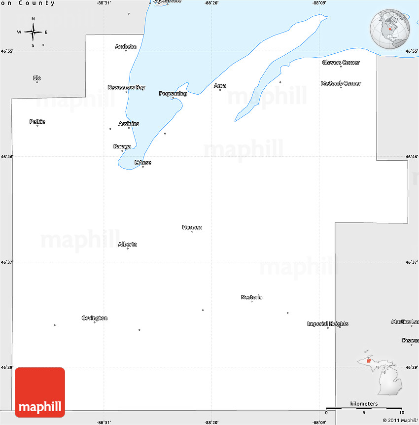The simple silver style outline map represents one of several map types and styles available. Look at Baraga County, Michigan, United States from different perspectives.