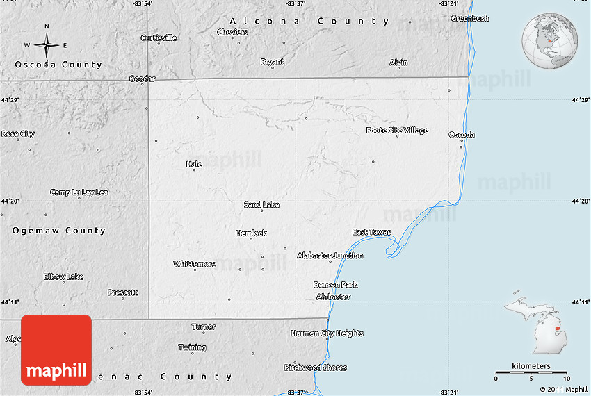 The flat silver style map represents one of several map types and styles available. Look at Iosco County, Michigan, United States from different perspectives.
