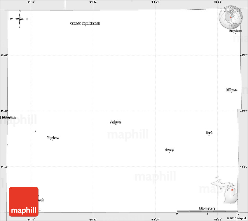 The simple silver style outline map represents one of several map types and styles available. Look at Montmorency County, Michigan, United States from different perspectives.