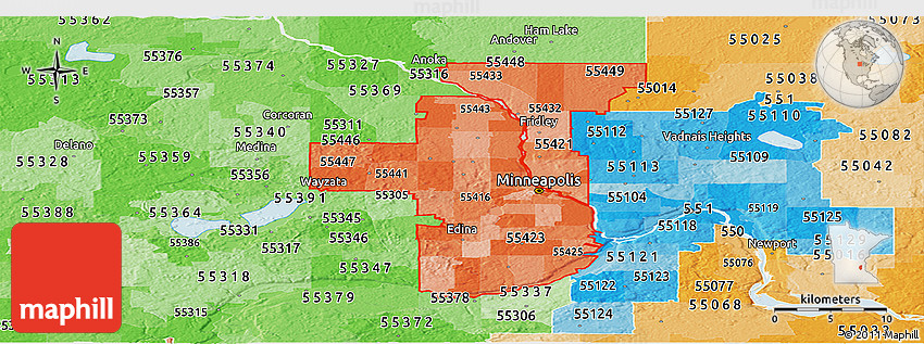 The panoramic political shades map represents one of several map types and styles available. Look at ZIP codes starting with 554 from different perspectives.