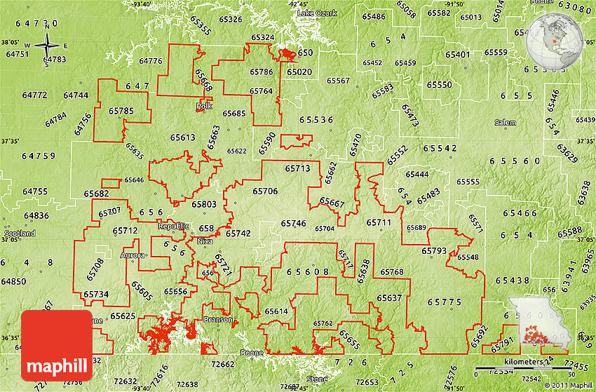 The flat physical map represents one of several map types and styles available. Look at ZIP codes starting with 657 from different perspectives.