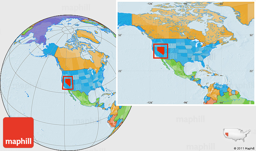 Maphill is a collection of map images. This image combines a political map with the globe centered on Nevada. Use the buttons under the image to switch to different map types.