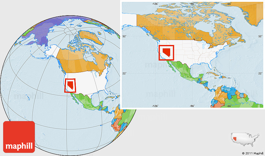 Maphill is a collection of map images. This image combines a political map with the globe centered on Nevada. Use the buttons under the image to switch to different map types.