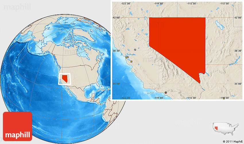 Maphill is a collection of map images. This image combines a shaded relief map with the globe centered on Nevada. Use the buttons under the image to switch to different map types.