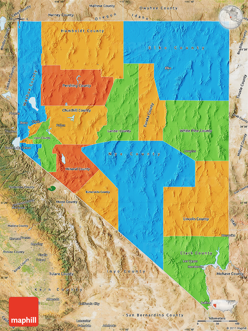The choice of color is not related to the characteristics of Nevada, colors are assigned to countries and regions randomly. The capital is marked with a black star inside a white circle. Squares and circles of various size indicate other major cities.