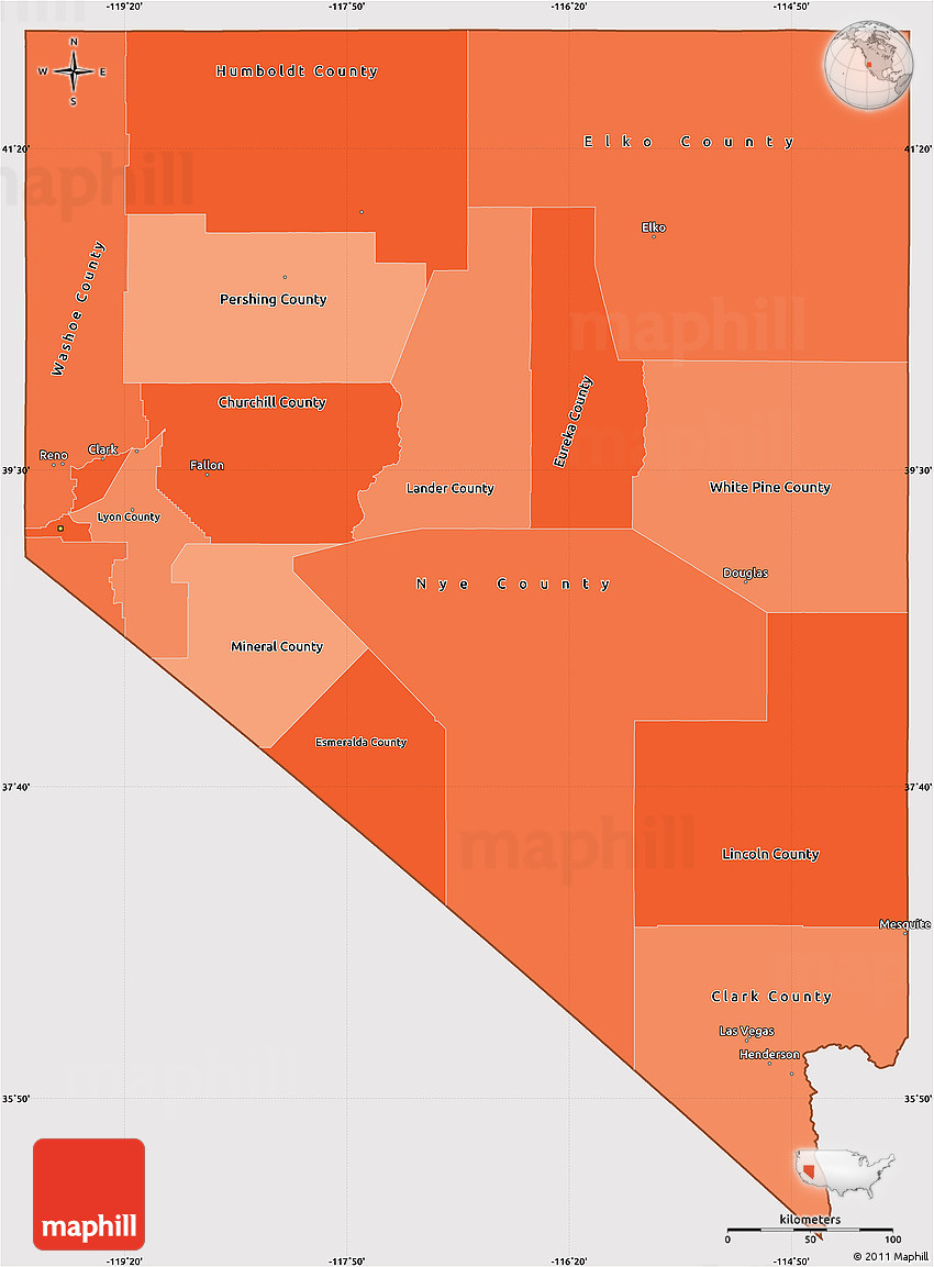 Political shades map is similar to a political map, however different regions are represented by the tints and shades of the same color, not by different colors. The purpose of a political map of Nevada is to provide information about how people have divided up the world into countries and administrative regions.