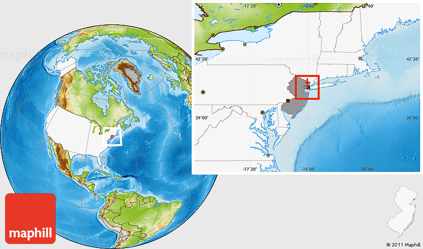 Maphill is a collection of map images. This image combines a physical map with the globe centered on ZIP code 07304. Use the buttons under the image to switch to different map types.
