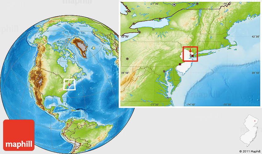 Maphill is a collection of map images. This image combines a physical map with the globe centered on ZIP code 07424. Use the buttons under the image to switch to different map types.