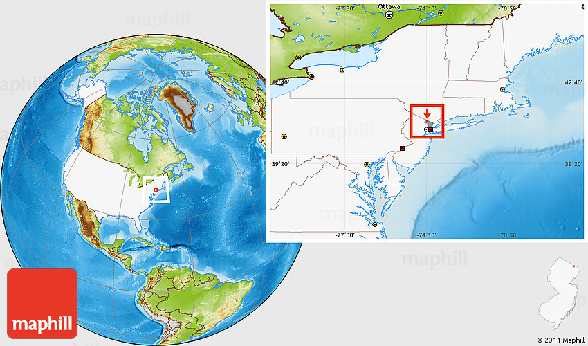 Maphill is a collection of map images. This image combines a physical map with the globe centered on ZIP code 07446. Use the buttons under the image to switch to different map types.