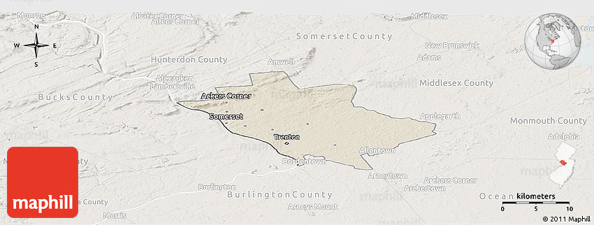 The panoramic shaded relief map represents one of several map types and styles available. Look at Mercer County, New Jersey, United States from different perspectives.