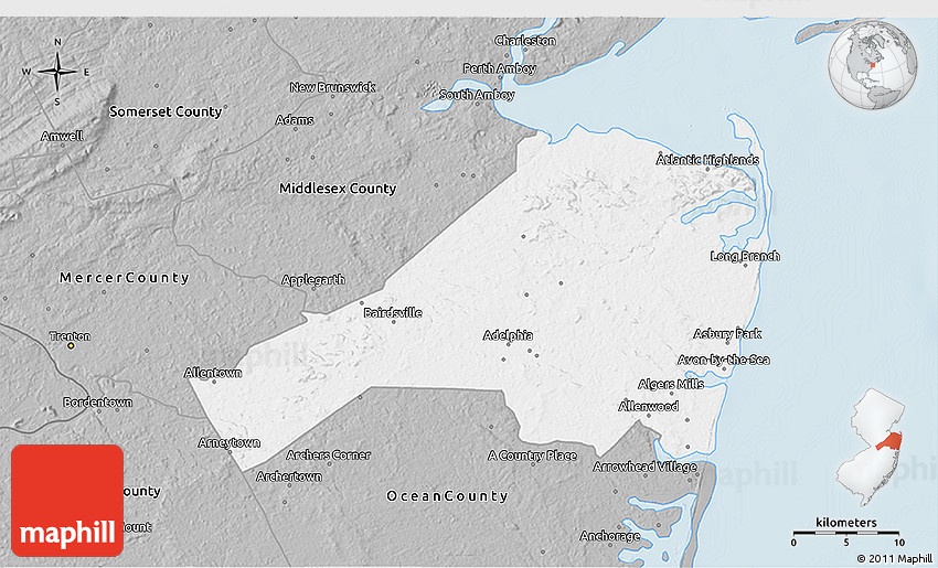 The 3D gray map represents one of several map types and styles available. Look at Monmouth County, New Jersey, United States from different perspectives.