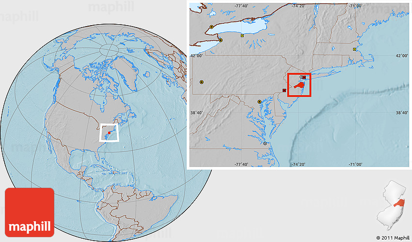 Maphill is a collection of map images. This image combines a gray map with the globe centered on Monmouth County. Use the buttons under the image to switch to different map types.