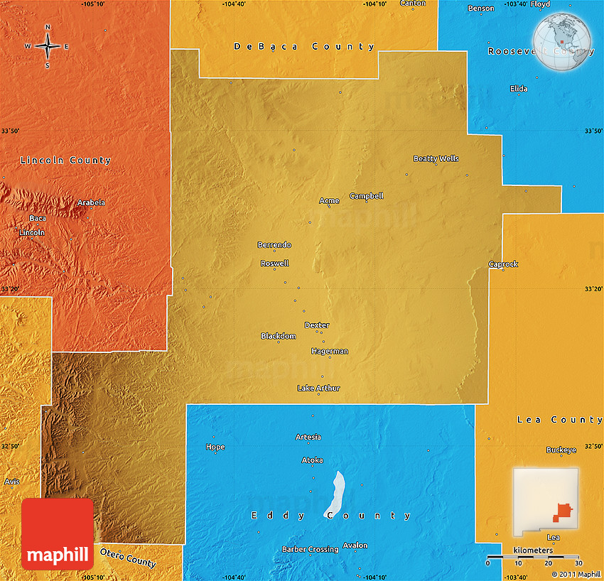 The flat physical map represents one of several map types and styles available. Look at Chaves County, New Mexico, United States from different perspectives.