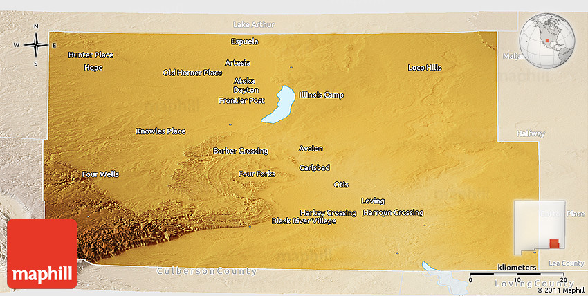 The panoramic physical map represents one of several map types and styles available. Look at Eddy County, New Mexico, United States from different perspectives.