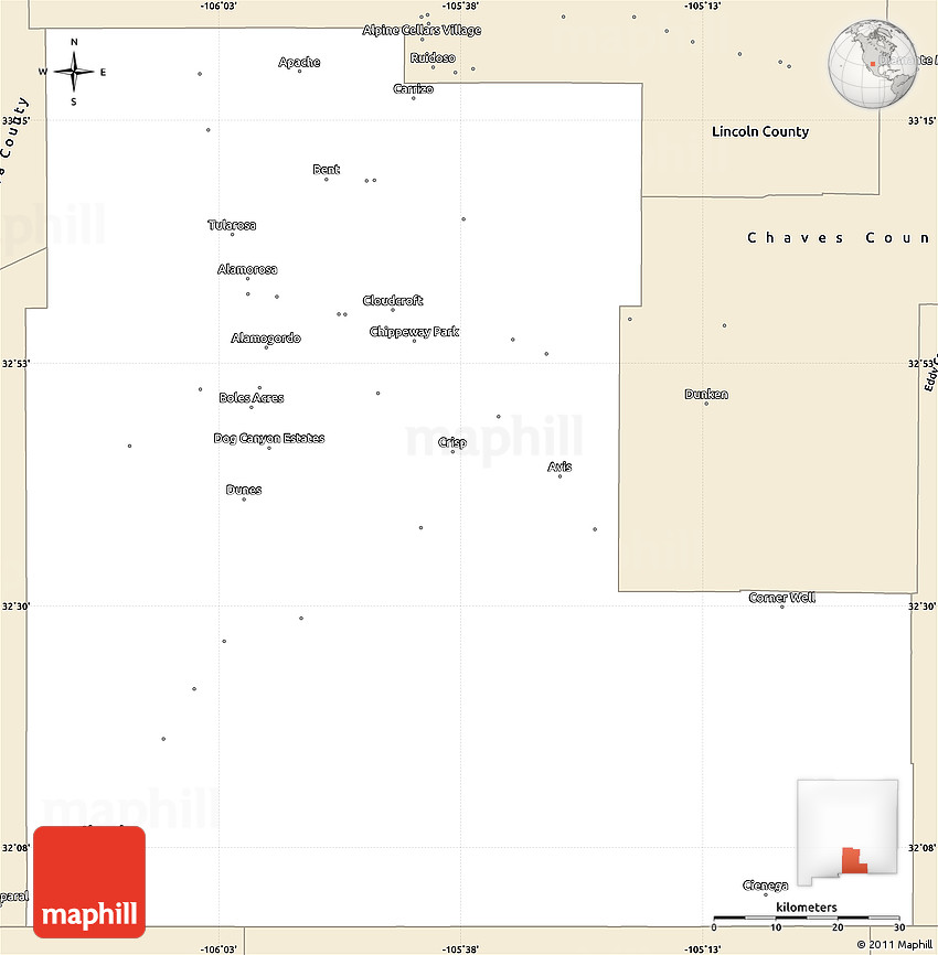 The simple classic style outline map represents one of several map types and styles available. Look at Otero County, New Mexico, United States from different perspectives.