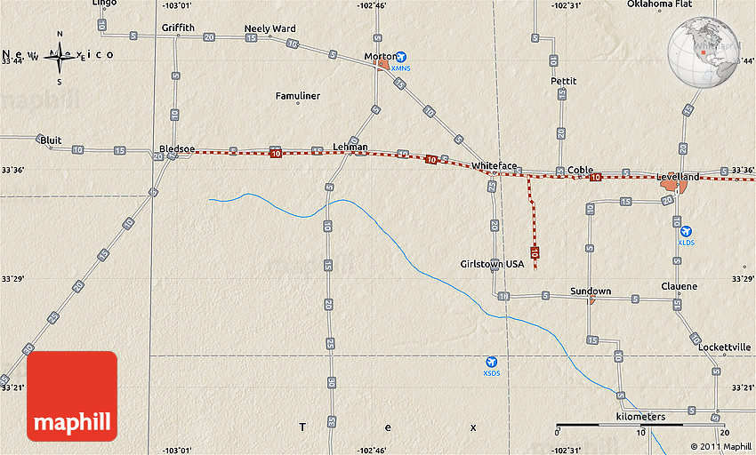 The flat shaded relief map represents one of many map types available. Look at Bluit, Roosevelt County, New Mexico, United States from different perspectives.