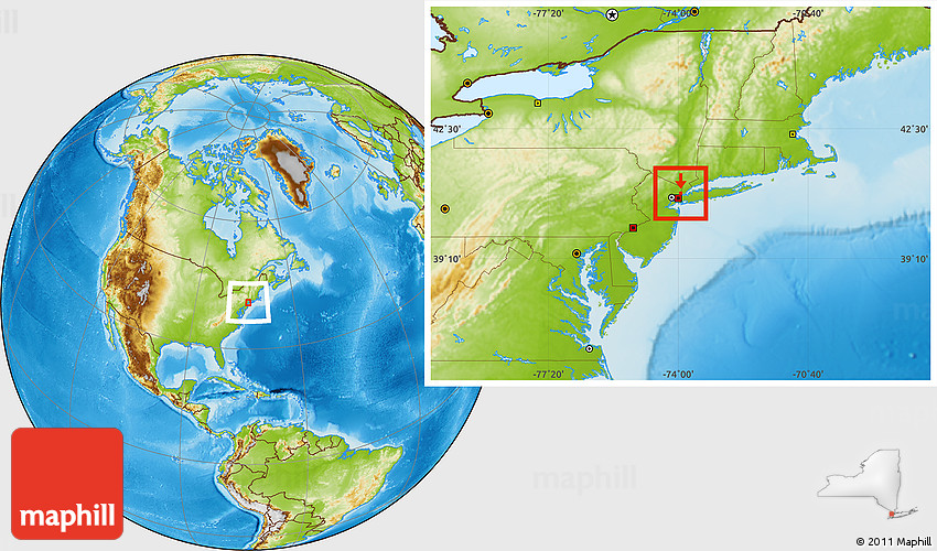 Maphill is a collection of map images. This image combines a physical map with the globe centered on ZIP code 10032. Use the buttons under the image to switch to different map types.