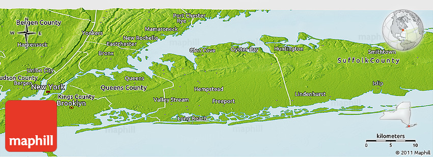 The panoramic physical map represents one of several map types and styles available. Look at Nassau County, New York, United States from different perspectives.
