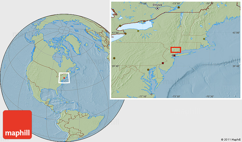 The location map of Ossining combines two projections: the orthographic azimuthal projection for the globe and the simple geographic projection for the rectangular part of the map. Geographic projection has straight meridians and parallels, each degree of latitude and longitude is the same size over the entire world map.