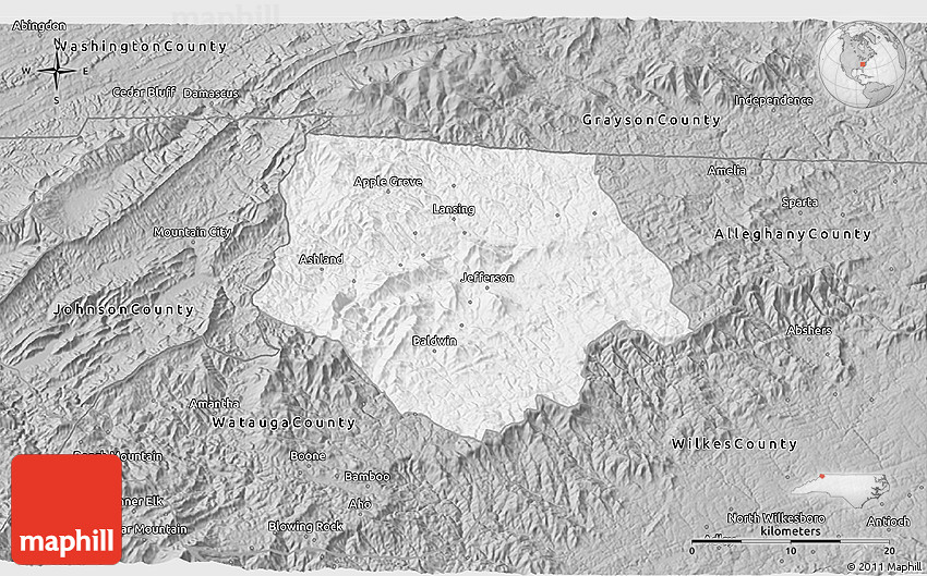 The 3D gray map represents one of several map types and styles available. Look at Ashe County, North Carolina, United States from different perspectives.