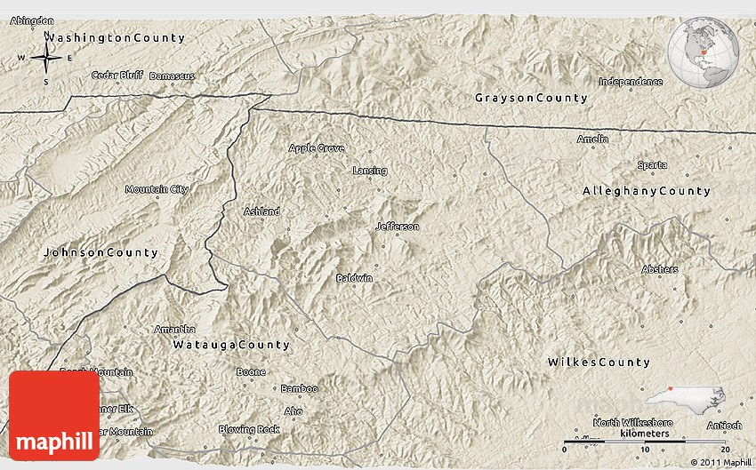 Shaded relief map shows landscape features, such as mountains, valleys and plateaus. Flat areas are smooth on the map, areas with steep slopes and mountains appear more rough. The above map of Ashe County was created using a digital elevation model.