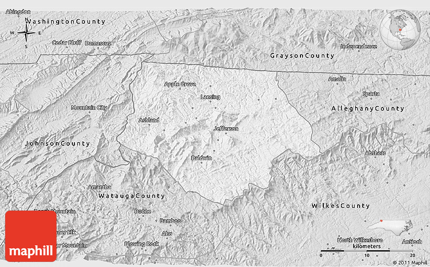 The 3D silver style map represents one of several map types and styles available. Look at Ashe County, North Carolina, United States from different perspectives.