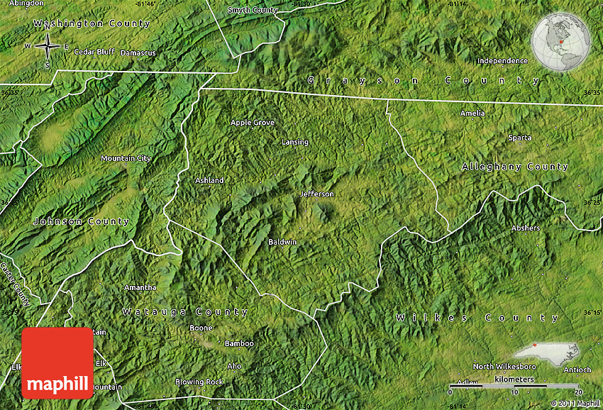 The flat satellite map represents one of several map types and styles available. Look at Ashe County, North Carolina, United States from different perspectives.