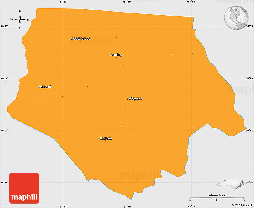 The simple political outline map represents one of several map types and styles available. Look at Ashe County, North Carolina, United States from different perspectives.