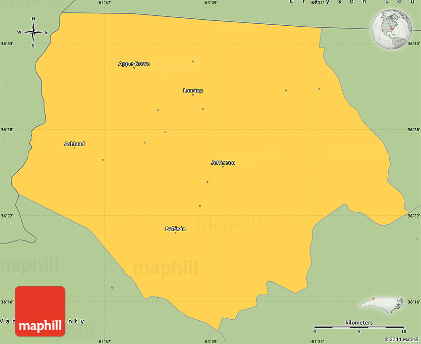 The simple savanna style outline map represents one of several map types and styles available. Look at Ashe County, North Carolina, United States from different perspectives.
