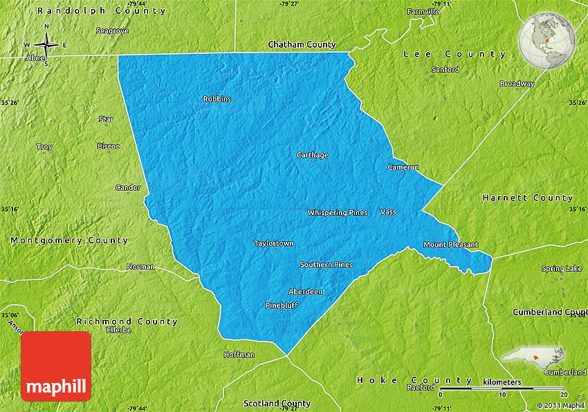 The flat political map represents one of several map types and styles available. Look at Moore County, North Carolina, United States from different perspectives.