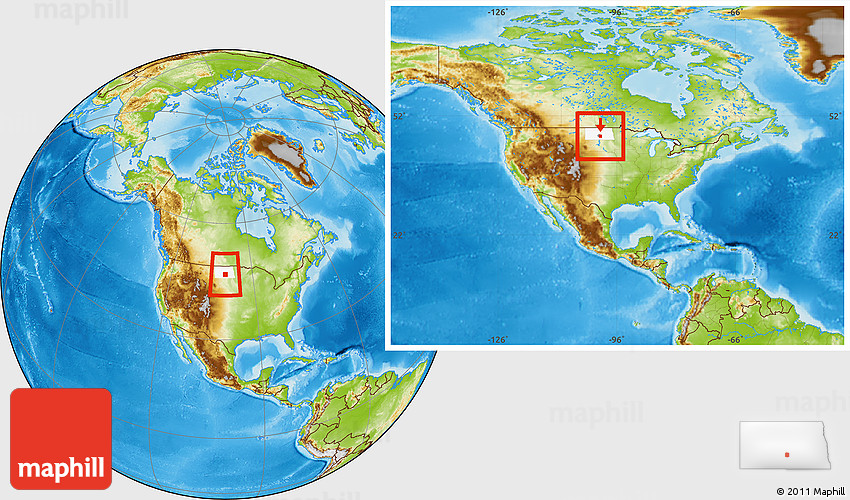 Maphill is a collection of map images. This image combines a physical map with the globe centered on ZIP code 58532. Use the buttons under the image to switch to different map types.