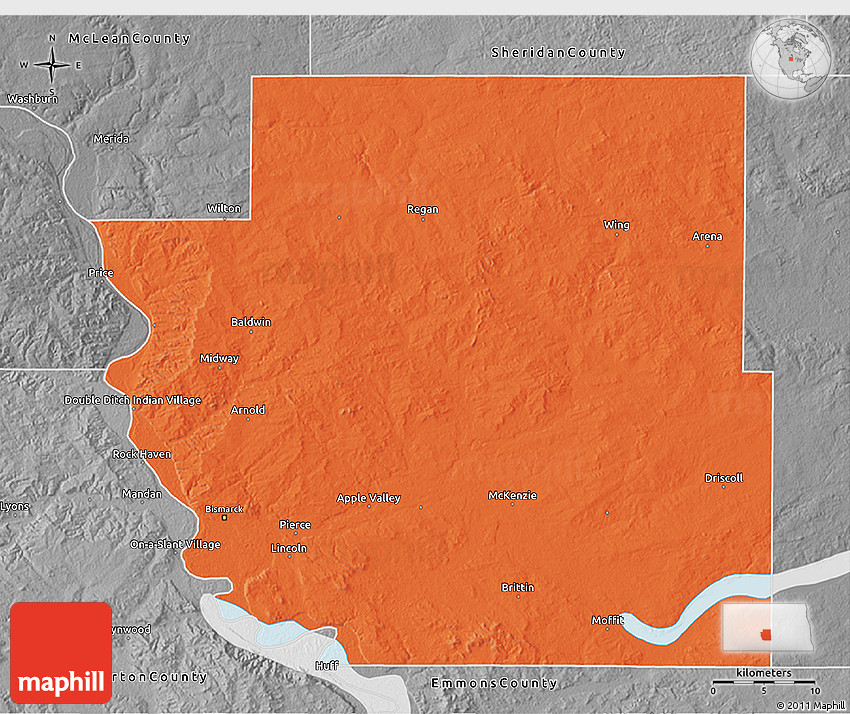The 3D political map represents one of several map types and styles available. Look at Burleigh County, North Dakota, United States from different perspectives.