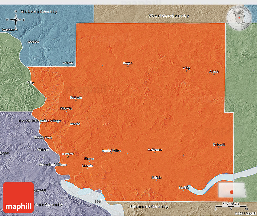 The 3D political map represents one of several map types and styles available. Look at Burleigh County, North Dakota, United States from different perspectives.