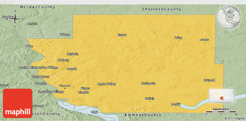 The panoramic savanna style map represents one of several map types and styles available. Look at Burleigh County, North Dakota, United States from different perspectives.