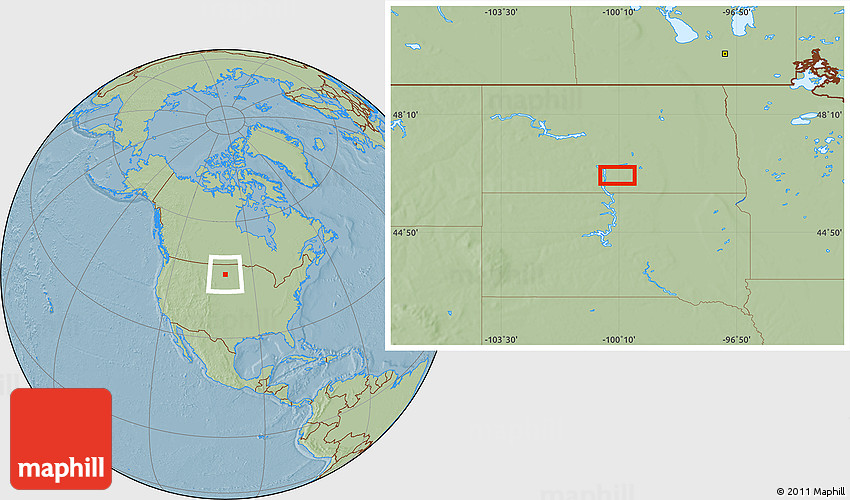 The location map of Fort Rice combines two projections: the orthographic azimuthal projection for the globe and the simple geographic projection for the rectangular part of the map. Geographic projection has straight meridians and parallels, each degree of latitude and longitude is the same size over the entire world map.