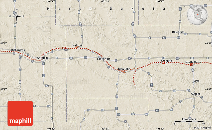 The flat shaded relief map represents one of many map types available. Look at North Almont, Morton County, North Dakota, United States from different perspectives.