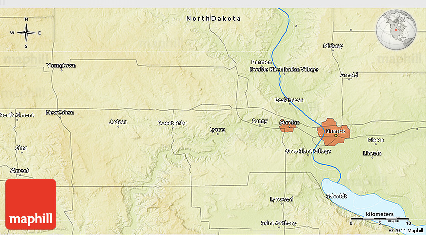 The 3D physical map represents one of many map types and styles available. Look at On-a-Slant Village, Morton County, North Dakota, United States from different perspectives.