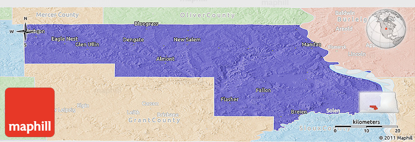The panoramic political map represents one of several map types and styles available. Look at Morton County, North Dakota, United States from different perspectives.
