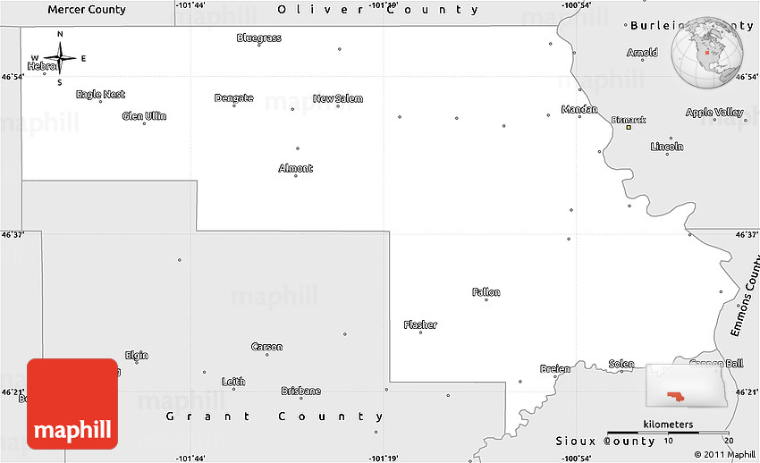 The simple silver style outline map represents one of several map types and styles available. Look at Morton County, North Dakota, United States from different perspectives.